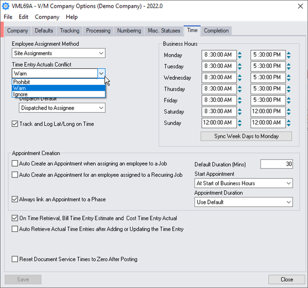 •Prohibit - Conflicts are not allowed and the user will be required to modify the time entry details